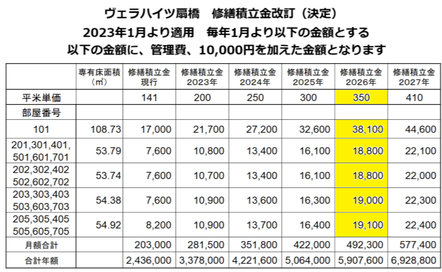 修繕積立金、増額(5年間、毎年2千円) 以下の表により、増額する